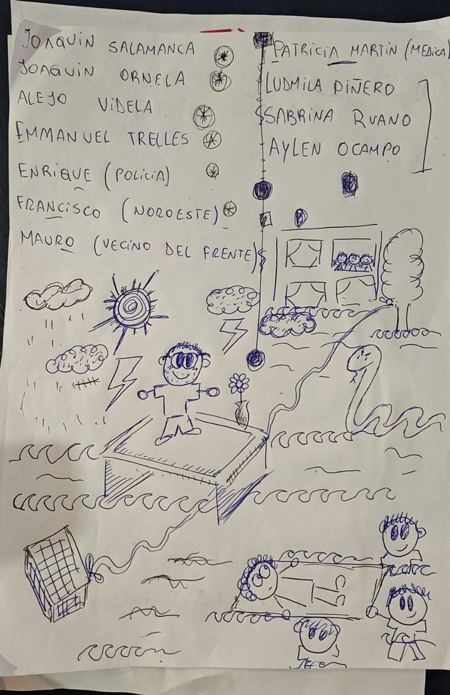 Para esa nota, apenas 3 días más tarde, Emmanuel Trelles, acompañante terapéutico y docente, dibujó, creativo y talentoso, la primera escena de aquella mañana para que no se le escaparan cosas. Lo dibujado: nombres, flores, mi mamá en la camilla improvisada, árboles, nubes, truenos, un sol espiralado, personitas entre las olas, y en la ventana de un edificio. Y hasta una víbora.