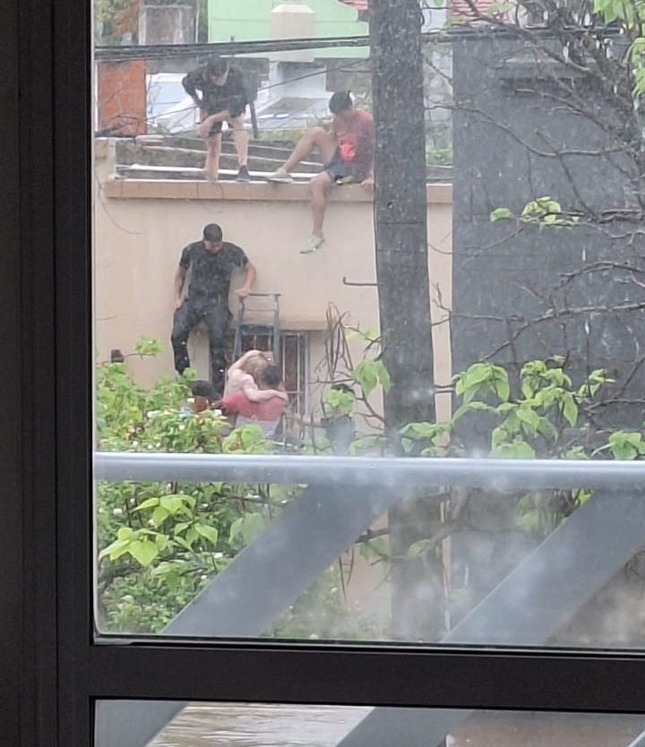Alicia, otra vecina, zafó de 3 metros de agua, saliendo por 3 techos. Su perra saltó al agua mientras ella trepaba. Al rato la vieron desde el balcón. Nadaba. Flotaba. Y los chicos del departamento bajaron y se metieron para salvarla.