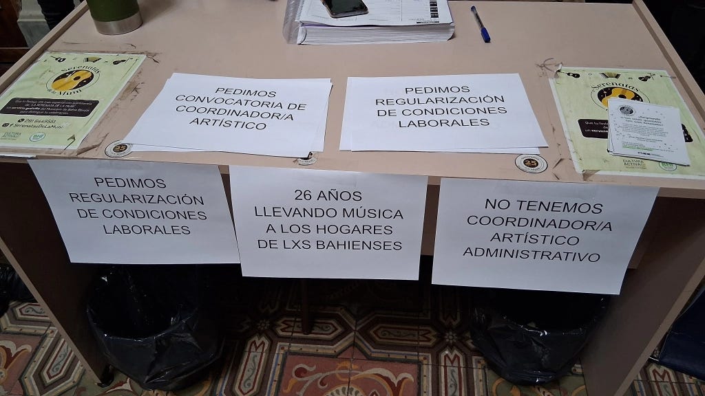 Serenatas de la Muni: según la Unión de Músicos del Sur, el Municipio decidió congelar la modalidad de contratación vigente, implementar la contratación en formato tercerizado por cooperativa por lo que resta del año, no cubrir el cargo de coordinador y retractarse de los compromisos asumidos previamente. (Frente a Cano)