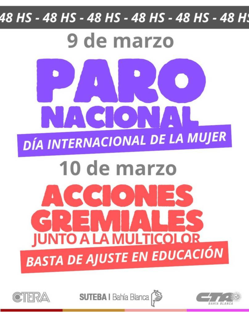 La filial bahiense del gremio docente SUTEBA inicia este lunes un paro de 48 horas, por lo que algunos establecimientos educativos de la ciudad tendrán su actividad parcial o totalmente suspendida. (La Nueva.)