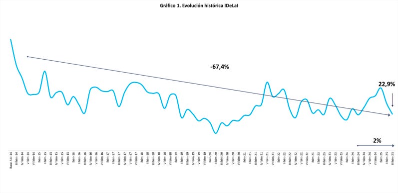 📊 Si se realiza una comparación anual puede verse una suba de alrededor del 2%. Aunque si se analizan los valores obtenidos desde el inicio de las mediciones (abril de 2014), se aprecia una caída del 67,4%.