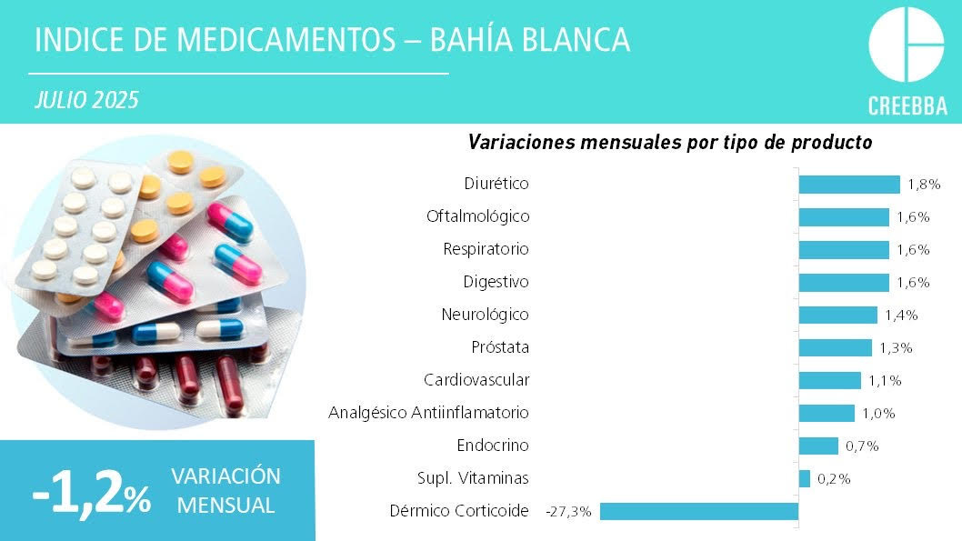 • La principal baja se dio en los productos dérmicos corticoide (-27,3%). Mientras que los diuréticos (1,8%), oftalmológicos (1,6%), respiratorios (1,6%) y digestivos (1,6%) subieron su valor.