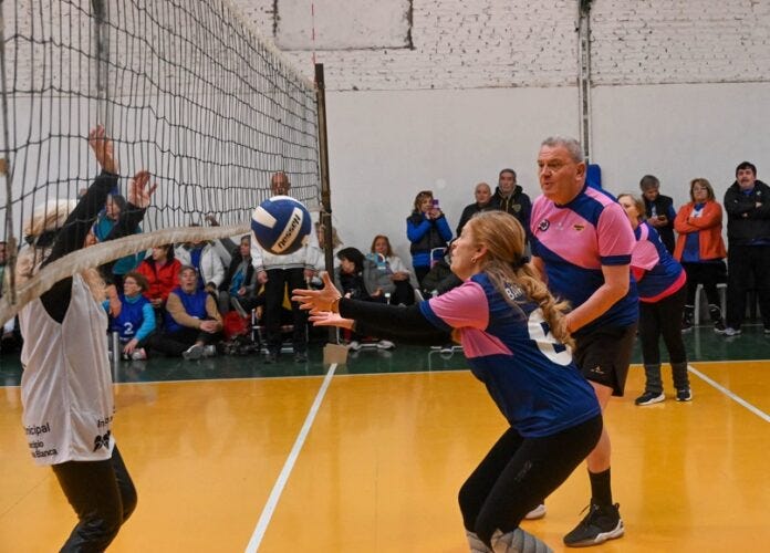 • Como te contamos, el deporte es una adaptación del vóley. En el newcom se permite tomar la pelota y lanzarla hacia el otro lado, haciendo 3 pasos.