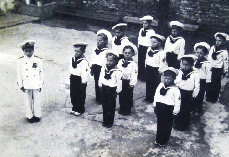 Comenzó, entonces, la búsqueda de fotos en álbumes y sobres del acervo familiar. Y apareció una. Del acto de fin de curso de 1943. Tiempos de guerra: una formación de marineros, con Lucio como capitán.