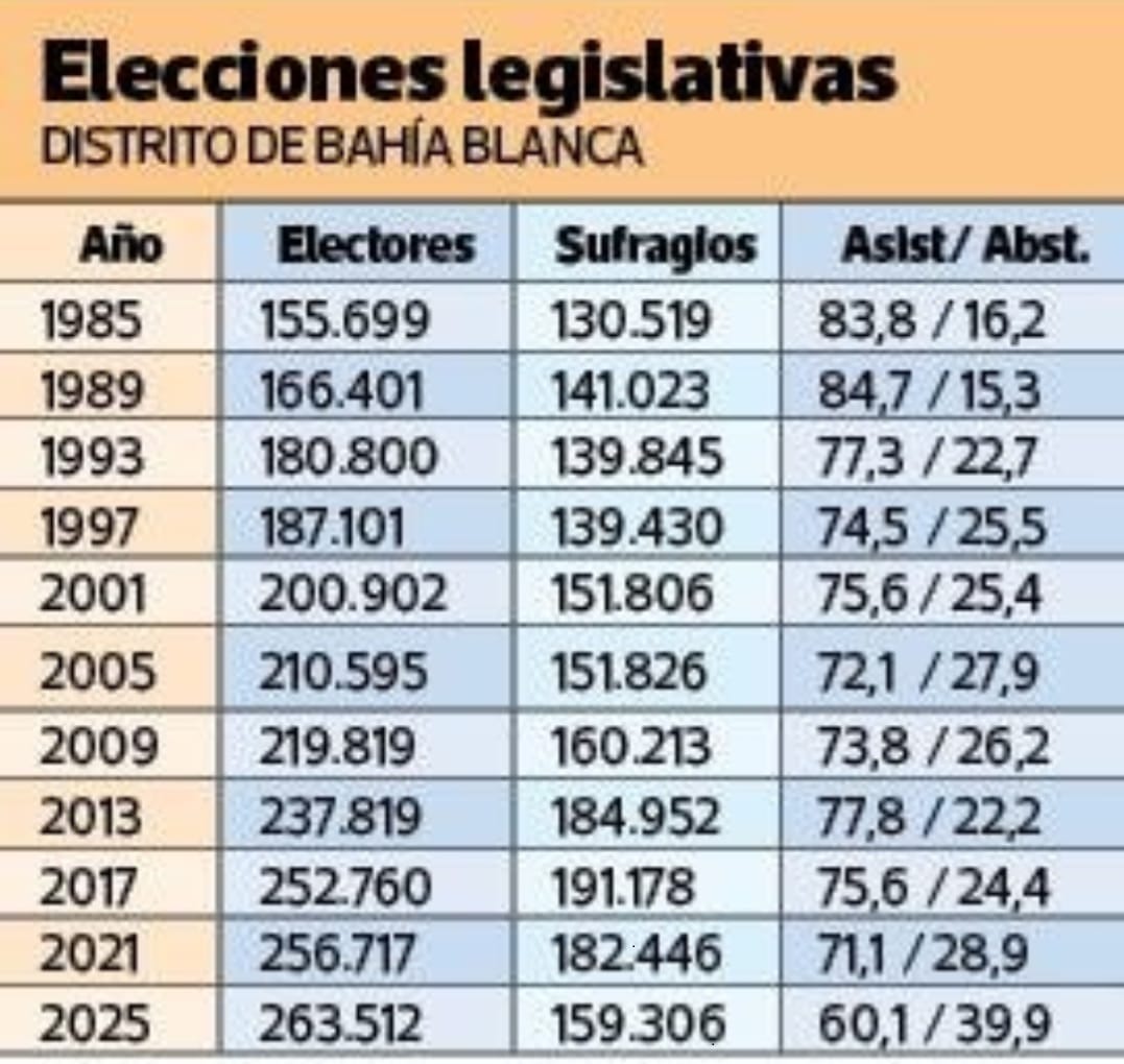El ausentismo fue parejo en todo el distrito, aunque trepó por encima del 41% en Ingeniero White, la única localidad en que Fuerza Patria (43,86%) venció a La Libertad Avanza (36,18%).