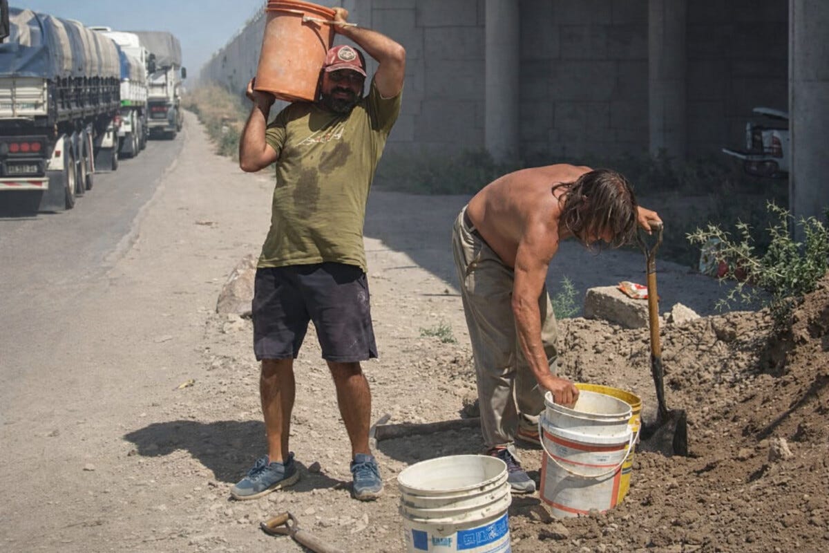 • Vecinos y camioneros rellenaron con tierra y tosca los pozos en Sesquicentenario, a la altura de la rotonda con Don Bosco. (LB24)