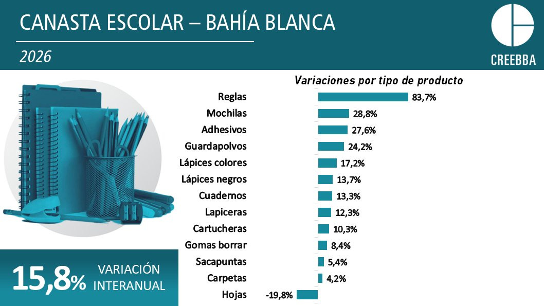 • Los principales aumentos se dieron en reglas (83,7%), mochilas (28,8%), adhesivos (27,6%) y guardapolvos (24,4%). Las hojas disminuyeron su valor un 19,8%.