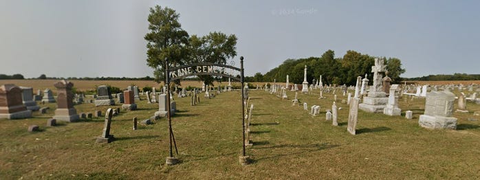 - 👀 El cementerio ese ni siquiera aparece marcado en los mapas de Google: debí recorrer cuadra por cuadra, con la ayuda del tipito amarillo Juan Roberto Street View. Y ahí está, en una llanura campera parecida a la que tenemos por acá: