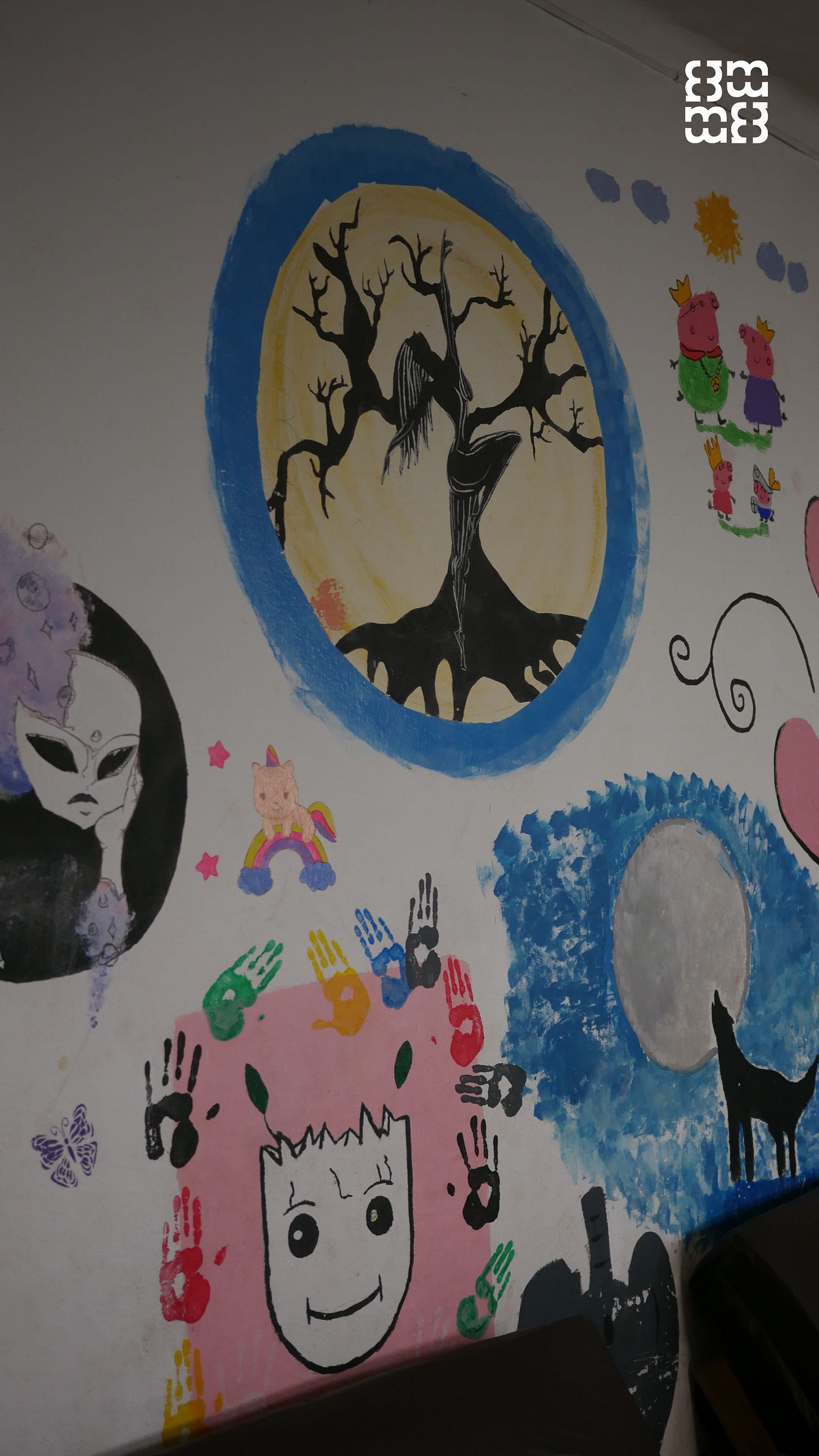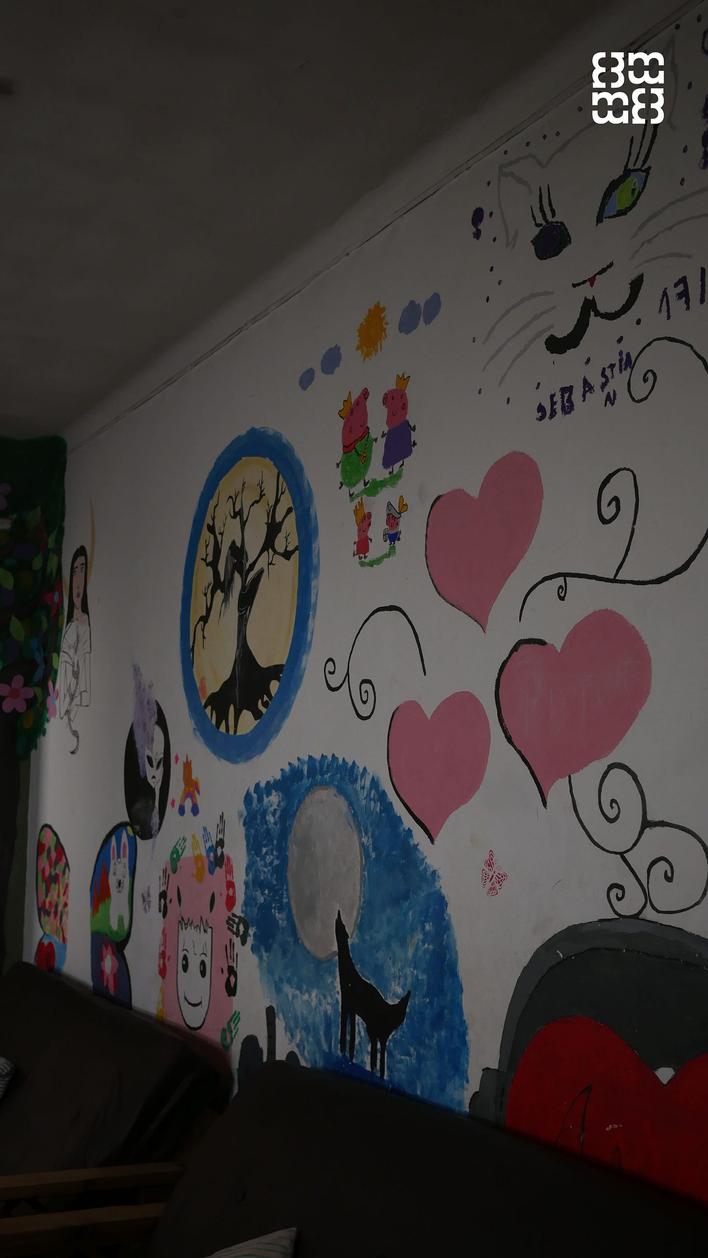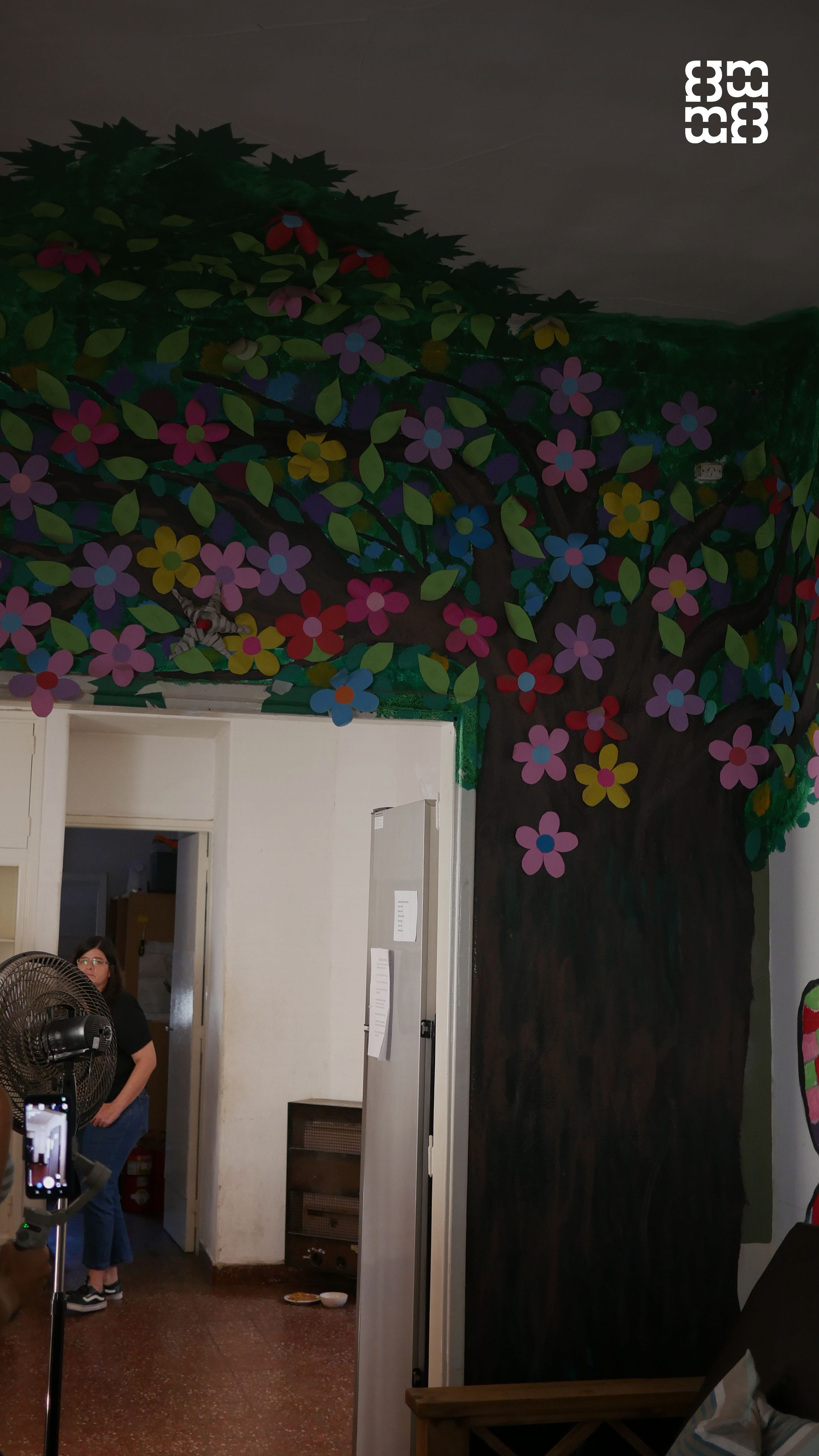 Las risas frescas llegan desde el fondo y rebotan contra las paredes llenas de dibujos que fueron dejando otros chicos que pasaron por acá. Por ejemplo: un árbol oscuro, sus ramas extendidas, el horizonte más claro y acogedor.
