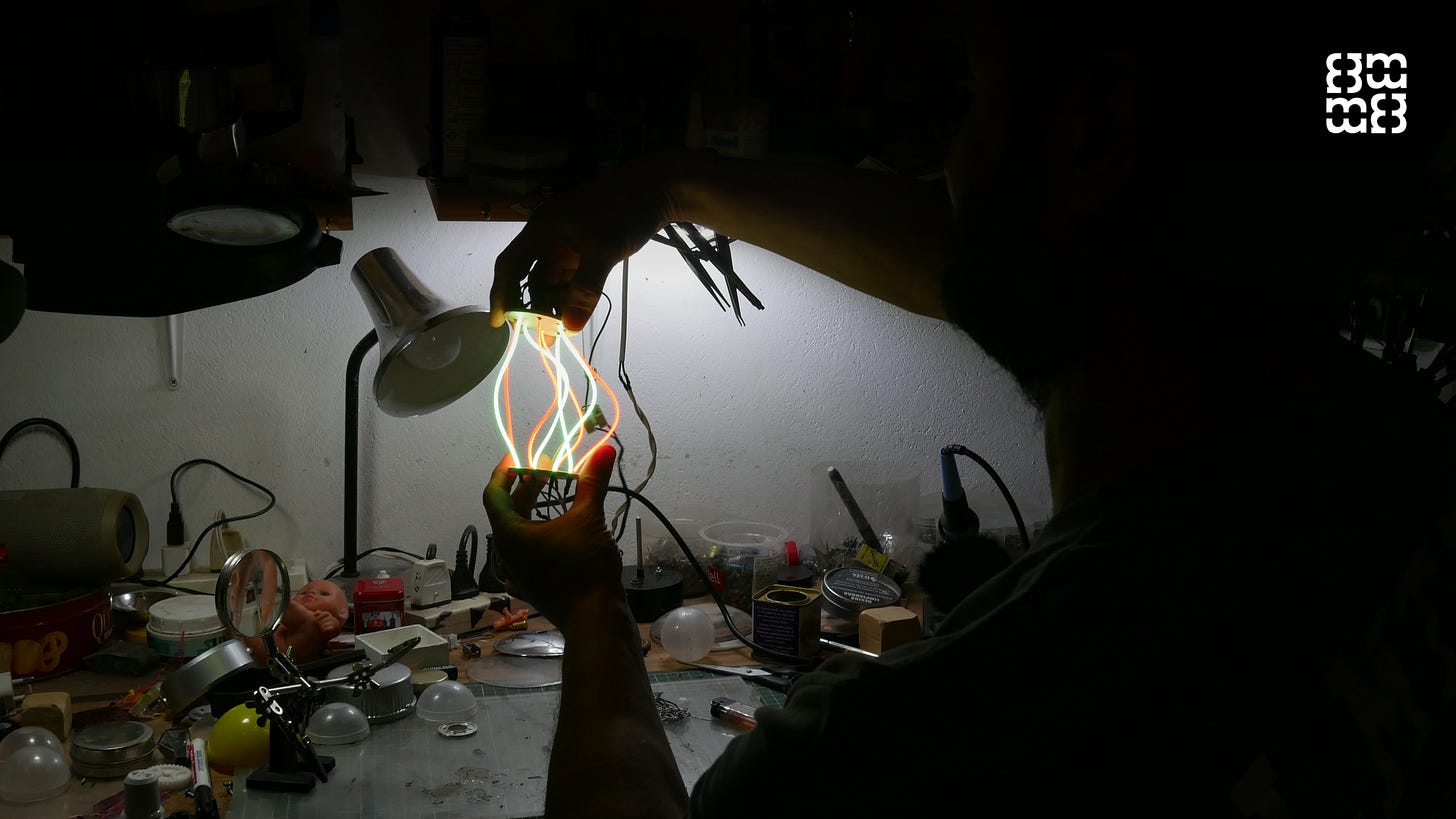 Entre sus invenciones preferidas figuran un estacionamiento para robots con 150 vehículos en miniatura (una estructura iluminada con LED y neón, con varios motores que le dan una estética retrofuturista), y unos lentes cuadrados que contienen una esfera giratoria de “forma rarísima” e iluminación LED.