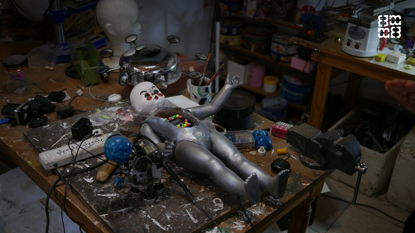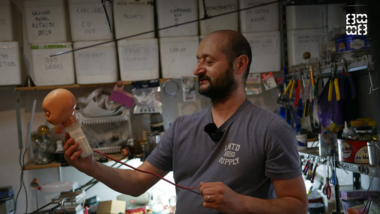 Hoy, con 52 años, tiene un pequeño taller en el barrio Pacífico repleto de objetos animatrónicos, es decir, piezas intervenidas con mecanismos electrónicos: